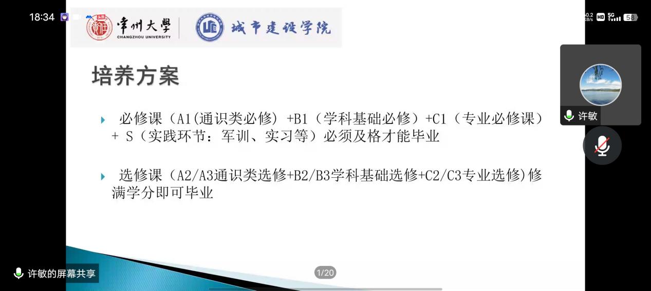 会议中,许敏首先为同学们梳理了培养方案,并以2019级土木专业培养方案为例,从各类课程的总学时数、学分数、起止周数等方面进行了详细的阐述;其次,许敏向大家明确了授予学位条件,即绩点达到3.4、通过大学英语四级且无处分,并对网上选课、课程修读分类方式概述了基本要求。随后,许敏向大家介绍了大学考试的相关规则,使大家明晰了考试的公平公正性;此外,她还就体育保健课的规则、教材的订购、学业警示等一些重点注意事项做了强调,她鼓励同学们遇到问题积极咨询,永奋斗开启美好的大学学习之旅。