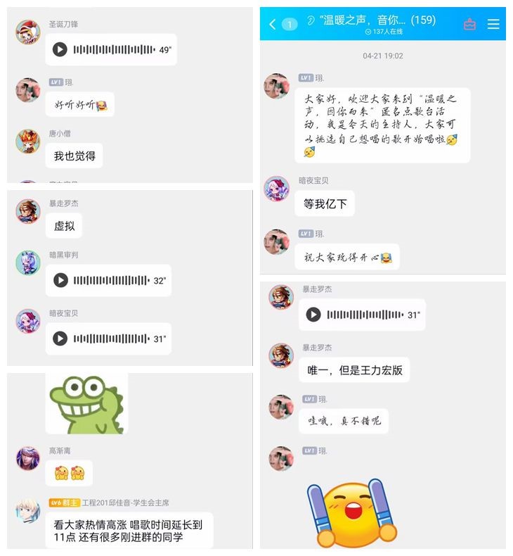 为丰富校园文化生活,给予学生展示才华的舞台,展现大学生朝气蓬勃、奋发向上的精神风貌。4月21日晚,色情卡通 于线上QQ群举办“温暖之声,音你而来”匿名点歌台活动,共计170名城建学子参加此次活动。