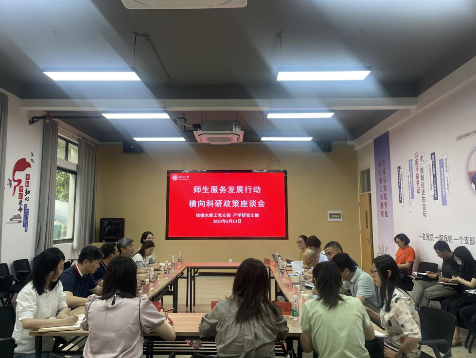 2023年6月13日下午,给排水教工党支部与产学研党支部于明行楼119会议室联合开展主题为“为师生服务发展行动-横向科研政策座谈会”党建共建活动。给排水教工党支部与产学研党支部党员参加会议。