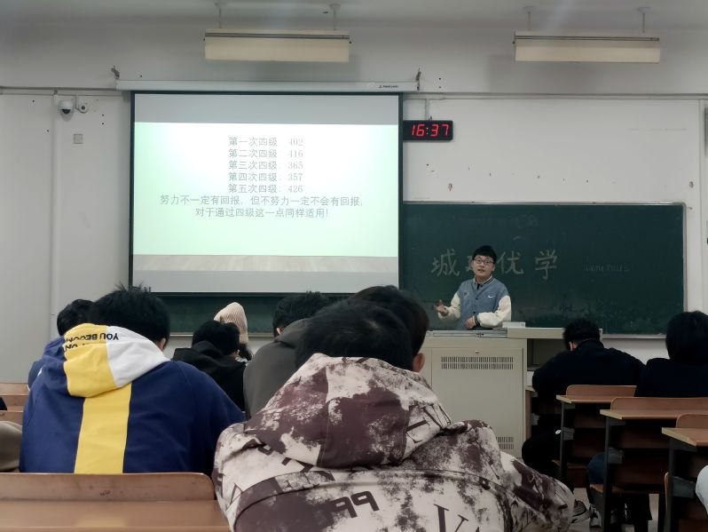 开班仪式共分三个流程。首先,由上期辅导班成功通过大学英语四级的同学依次分享英语四级备考经验和参加辅导班的收获。同学们从“听、说、读、写”四方面出发,对考试题型和流程做了详细介绍,并结合自身经验向同学们提供了切实、高效的备考方法。他们一致表示英语四级辅导班对同学们复习备考起到了有效的监督作用。随后,班主任许敏作动员讲话并详细介绍了辅导班安排。她强调了大学英语四级在大学学习中的重要地位,并表示辅导班经过一学期的试运行,取得良好成效,参与学员均顺利通过大学英语四级和考研英语国家线。最后,辅导员鼓励到场学生不要心存畏惧,掌握科学的备考方法。在今后的辅导班学习中,能脚踏实地备考,做到持之以恒。