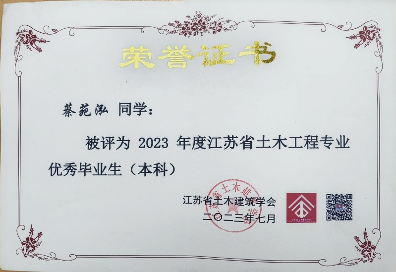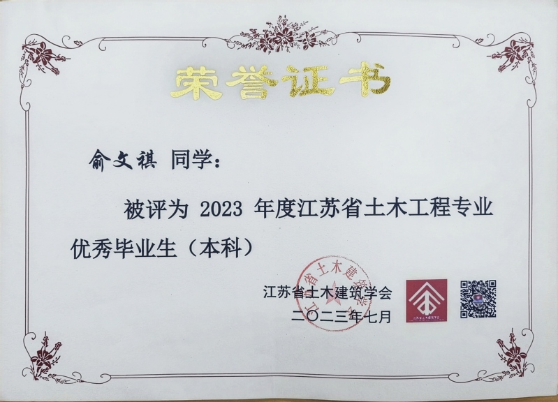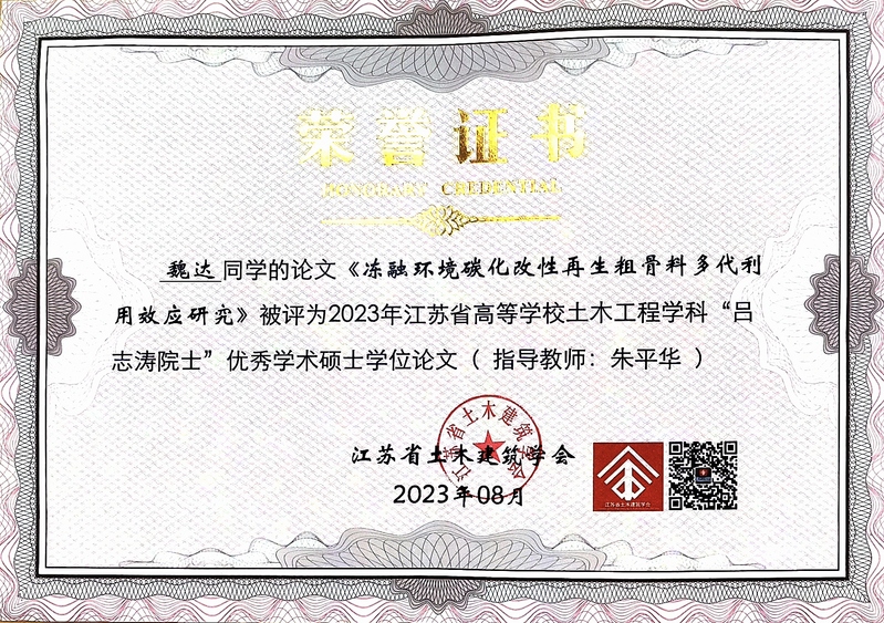 近日,从江苏省土木建筑学会传来喜讯,色情卡通 2023届本科毕业生土木工程专业俞文祺、蔡苑泓获评“2023年度江苏省土木工程专业优秀毕业生(本科)”,工程管理专业陈一诺获评“2023届江苏省大学生工程管理专业优秀毕业生”,硕士毕业生史志浩获评“2023年度江苏省土木工程专业优秀毕业生(硕士)”。硕士毕业生魏达的毕业论文《冻融环境碳化改性再生粗骨料多代利用效应研究》(指导教师:朱平华)被评为“2023年江苏省高等学校土木工程学科‘吕志涛院士’优秀学术硕士学位论文”。