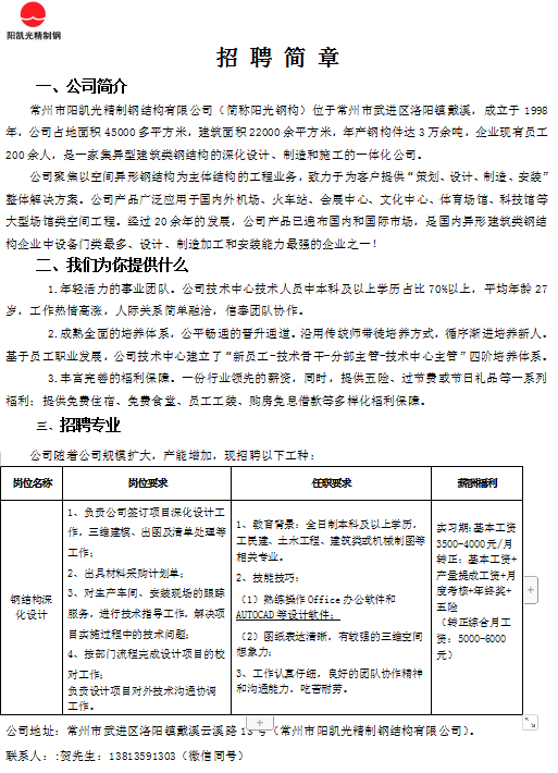 招聘[2024048]常州市阳凯光精制钢结构有限公司招聘简章