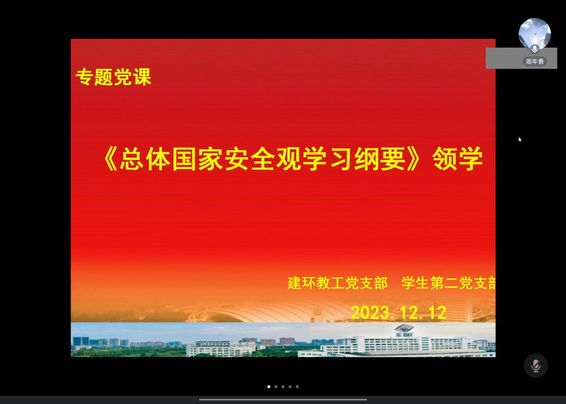 随后,学院院长助理、建环教工党支部副书记周年勇领学《总体国家安全观学习纲要》中的相关内容,并分享学习心得;随后就创新创业竞赛对学生党员展开指导,强调参加创新创业比赛的重要性,他希望教师党员要大力弘扬“大手拉小手”红色双创精神,为党育人、为国育才,引导青年学生将个人追求同国家发展紧密结合,将创新创业梦融入中华民族伟大复兴的中国梦,在科创实践的大舞台争做先锋、勇当闯将。