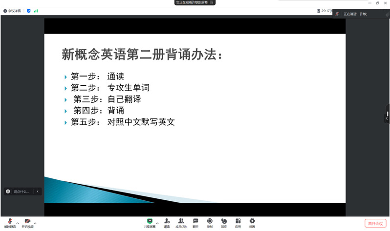 许敏指出,大学生英语四级证书是当下就业和考研的基础证书,建议利用充裕的寒假时间,制定个性化的学习计划。随后,许敏老师分享了每日背诵、阅读技巧、单词积累等方法,让同学们通过大量的阅读和背诵,增强语感,达到举一反三的水平。同时介绍了学院春学期四级帮扶计划,更有针对性地提高同学们的复习效率。