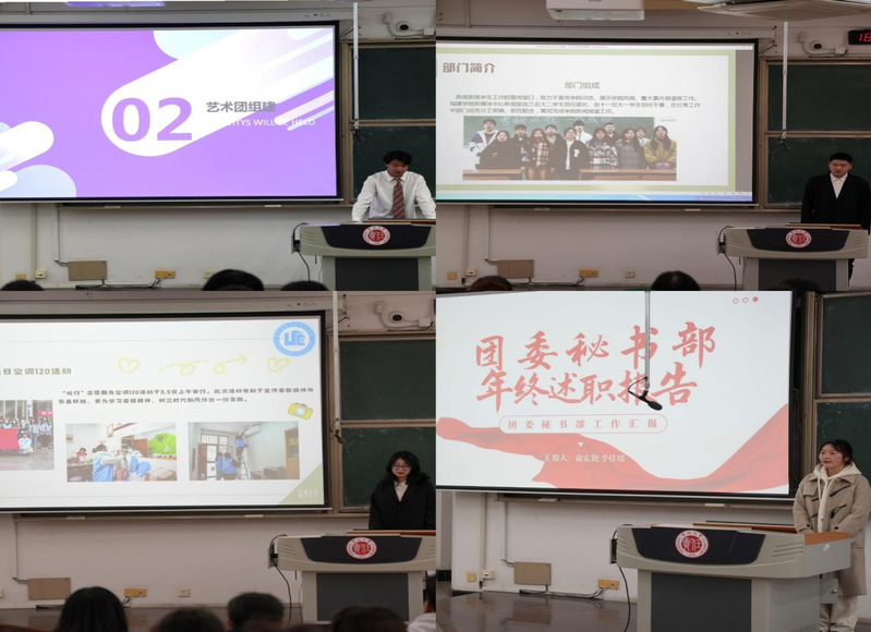 为总结回顾2023年工作,谋划推动新学年工作,3月20日,色情卡通 在W18教室召开团学组织年度述职评议大会暨2024年工作部署会,学工办主任封晓鸣、团学负责人程成、张争、邵丹迪和团学组织部长以上骨干参会。