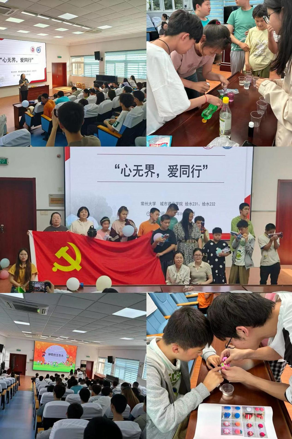 为让特教学生感受水科学的魅力,给排水教工党支部和学生代表开展“心系特教学子 爱心陪伴成长”智慧课堂展示活动。学生设计了“神奇的五色水”、“袋中的水循环系统”等小实验,带领特教学生感受了水世界的有趣和魅力。同时,通过“疯狂气球传递”、“折纸”和“粘土捏捏”等环节,点燃了特教孩子们的热情,积极参与互动,一张张稚嫩的脸庞上写满了认真。活动中,给排水教工党支部为特教孩子赠送了文具、牛奶和画笔等爱心物品。