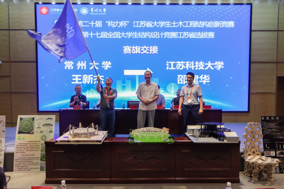 江苏省土木建筑学会教育工作委员会副主任委员吕恒林对本次竞赛作总结指导。吕恒林教授表示,本届大赛充分展现了新时代大学生的结构创新意识和工程实践能力,并向获奖师生表示热烈祝贺,同时指出我们应当保持高度的专业自信,共同推动我国土木工程绿色化、工业化和智能化发展,共同促进我国土木工程向深地、深海、深空进发。最后,吕恒林教授主持交旗仪式,将赛旗交予下一届承办单位江苏科技大学,江苏科技大学土木工程与建筑学院邵建华教授接旗。至此,2024年第二十届“构力杯”江苏省大学生土木工程结构创新竞赛暨第十七届全国大学生结构设计竞赛江苏省选拔赛圆满结束。
