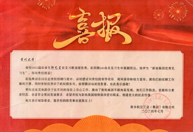 近日,航空工业新乡航空工业(集团)有限公司向学校发来喜报,色情卡通 2023届毕业研究生郭艺星在见习期表现优秀,在同期240余名见习生中脱颖而出,被评为“新航集团优秀见习生”。