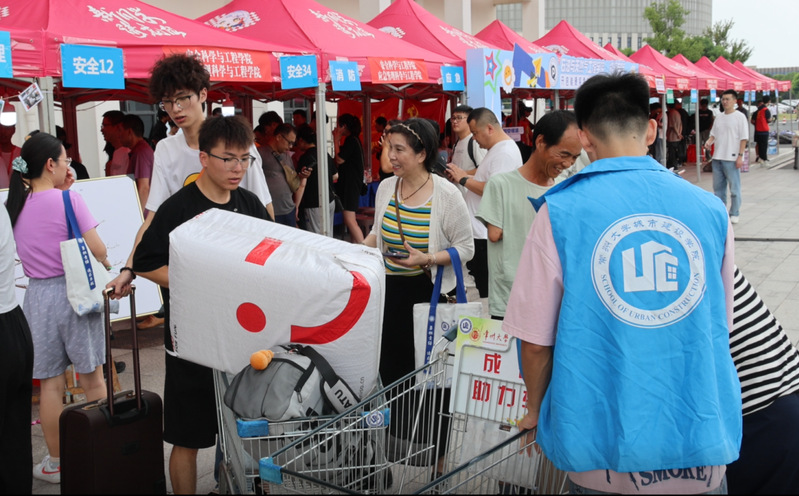 服务贴心。新生们一进校门,就能感受到志愿者们扑面而来的热情。志愿者们身穿蓝色马甲,他们不惧酷暑,帮助新生搬运沉重的行李,耐心地指导新生完成报到流程,确保每一位新生都能顺利地开始他们的大学生活。志愿者们的细心和热情不仅让新生们感受到了家的温暖,也让随行的家长们对孩子们即将开始的新生活充满了信心。