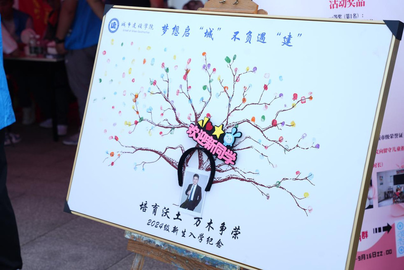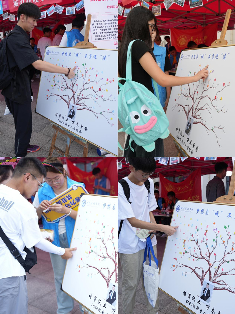 设计用心。城市建设,建立于土与木的画卷之上。根据这一灵感,学院特地设计了由沃土和树木枝干为主体的立牌,新生们的指纹将化作多彩的树叶“生长”在树木之上。与此同时,在学院的留影纪念墙上,新生们的名字被拼凑起来,组成了“梦想启‘城’ 不负遇‘建’”的标语。在按压指纹和拍照留念的过程中,同学们的幸福感和归属感被激发了出来,深深感受到城建大家庭的团结和温暖。