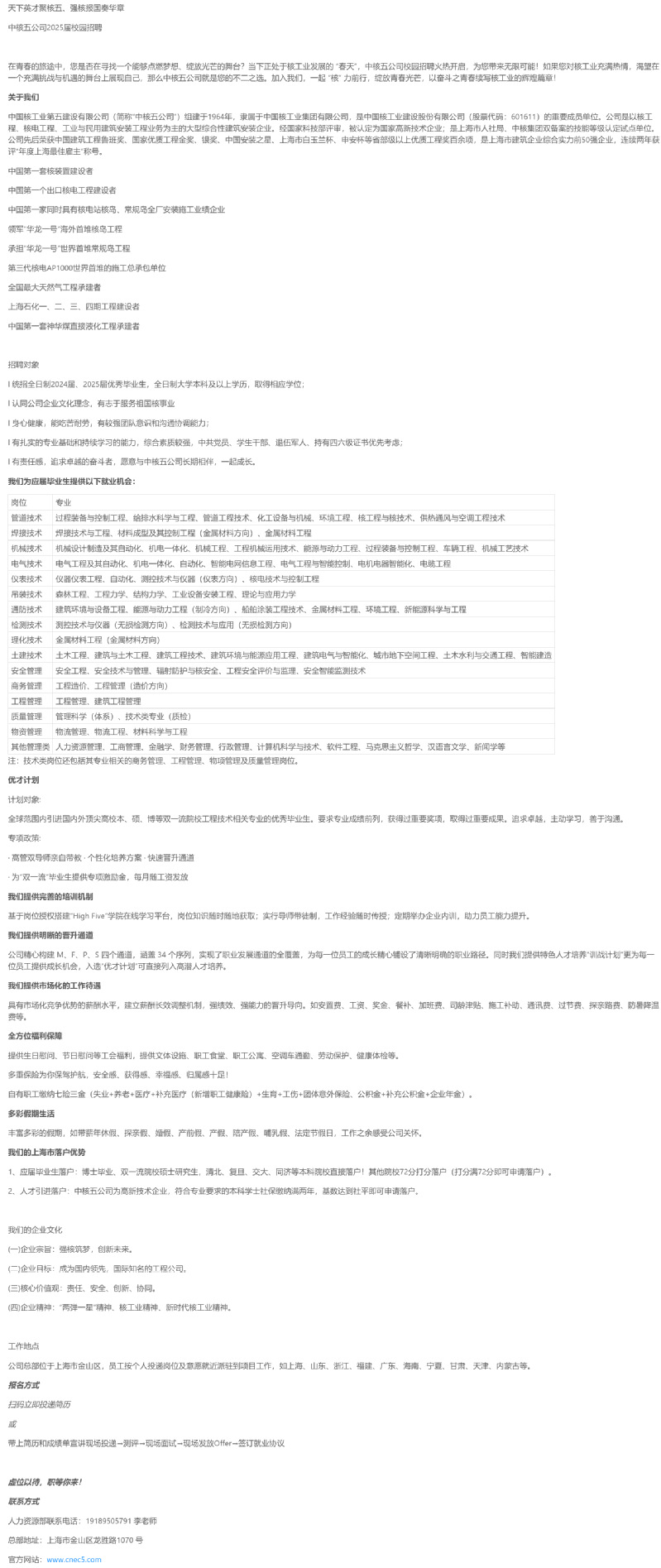 招聘[2024188]中国核工业第五建设有限公司校园招聘