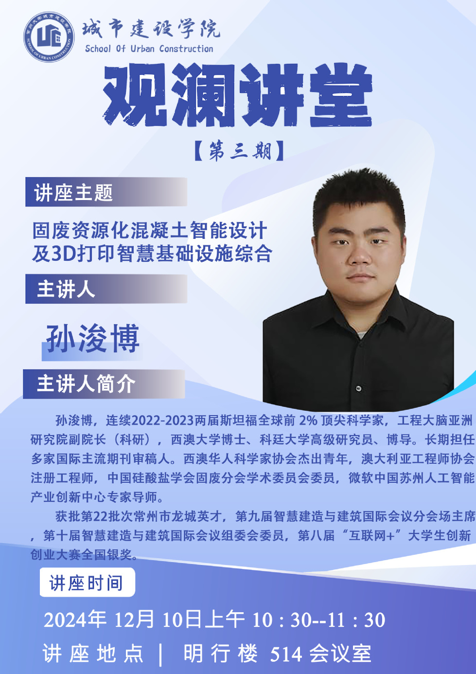 【观澜讲堂】第三期 固废资源化混凝土智能设计及3D打印智慧基础设施综合研究