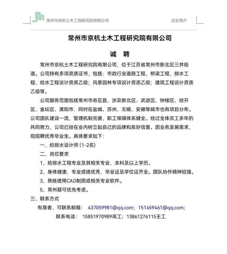 招聘[2024210]常州市京杭土木工程研究院有限公司2025招聘