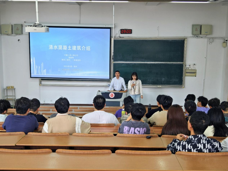 讲堂上,骆总介绍了清水混凝土的发展历史,又围绕深化技术、钢筋及模板施工技术、混凝土浇筑技术、成品保护技术等详细讲解了高品质清水混凝土的施工要点。最后,聚焦智能制造与城市更新等前沿领域,为同学们剖析建筑业未来走向,并结合行业趋势探讨职业规划。讲解中,他以实景图片与施工视频辅助演示,穿插互动问答,将专业内容转化为生动案例,整场讲座兼具学术深度与趣味性,现场反响热烈。