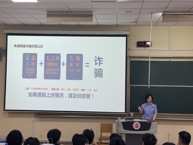 随后,学院特邀学校辖区派出所吴警官进行反诈宣讲。吴警官结合近年来高校学生遭遇的电信诈骗真实案例,深入浅出地剖析了常见的诈骗手段和套路。她详细讲解了刷单返利诈骗、网络贷款诈骗、冒充熟人诈骗等多种高发诈骗类型,通过还原诈骗过程,使同学们深刻认识到诈骗的隐蔽性和危害性。吴警官还重点强调了防范诈骗的方法和要点,提醒同学们务必做到“不轻信、不转账、不泄露个人信息”,遇到可疑情况要及时与老师、家长沟通或直接报警。在宣讲过程中,吴警官与同学们积极互动,耐心解答同学们提出的问题,现场气氛热烈。同学们纷纷表示,通过此次宣讲,对电信诈骗有了更清晰的认识,反诈意识和能力得到了显著提升。