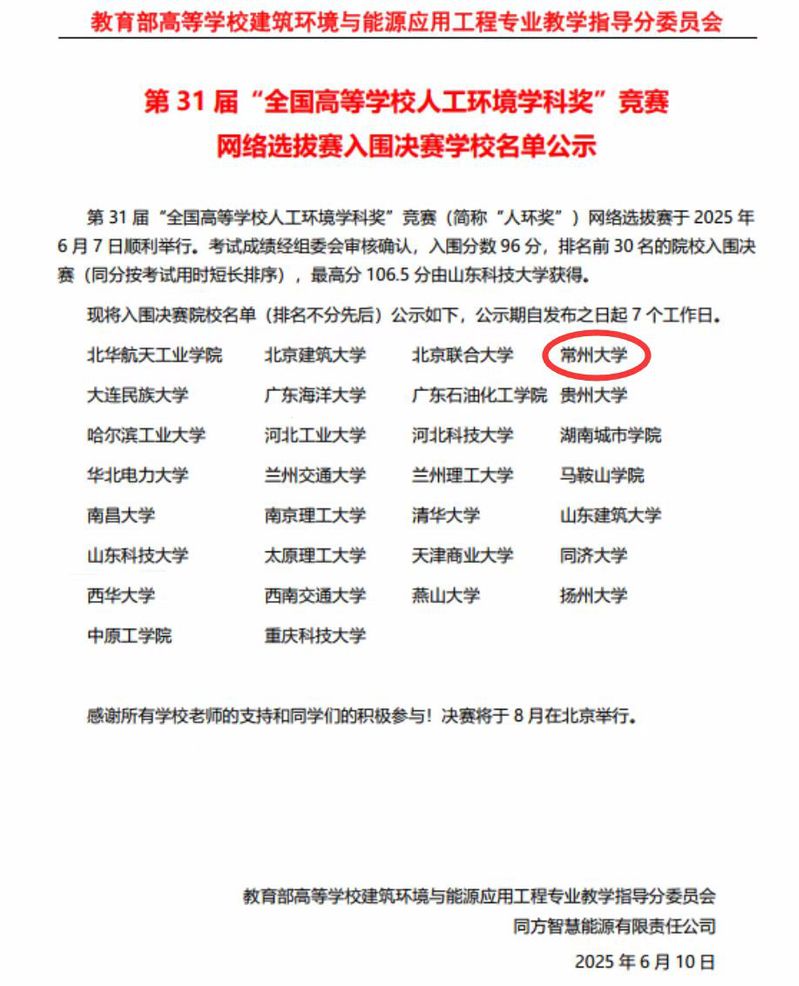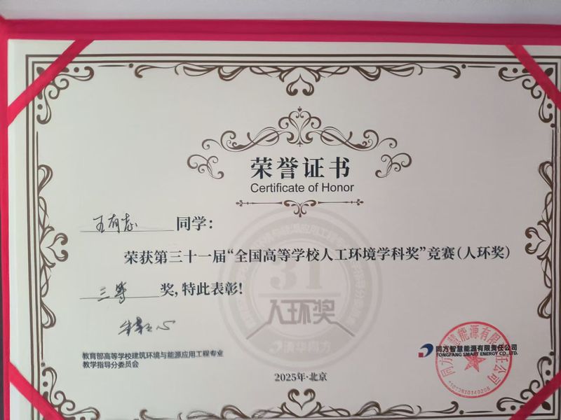 2025年8月29日,第31届“全国高等学校人工环境学科奖”竞赛决赛(以下简称“人环奖”)在北京圆满落下帷幕。我校色情卡通 建筑环境与能源应用工程专业建环221班学生王有志代表色情卡通 赴北京参加决赛,历经6月初的全国网络选拔初赛,色情卡通 顺利入围全国前30强晋级北京总决赛,最终荣获第31届“人环奖”全国三等奖。