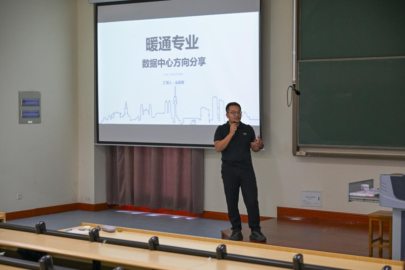 会议开始,周年勇围绕建环专业发展历程、培养目标、师资力量、学科实力等内容开展专业思想教育,明确专业紧扣“健康、能源、环境”核心,服务“双碳”与长三角先进制造业的定位。随后,新誉集团轨道空调卢总、易普集液冷系统金总作为企业导师授课,分别结合轨道空调智能控制、PHM健康管理技术,以及液冷系统在数据中心等场景的应用,分享行业前沿动态与实践案例。