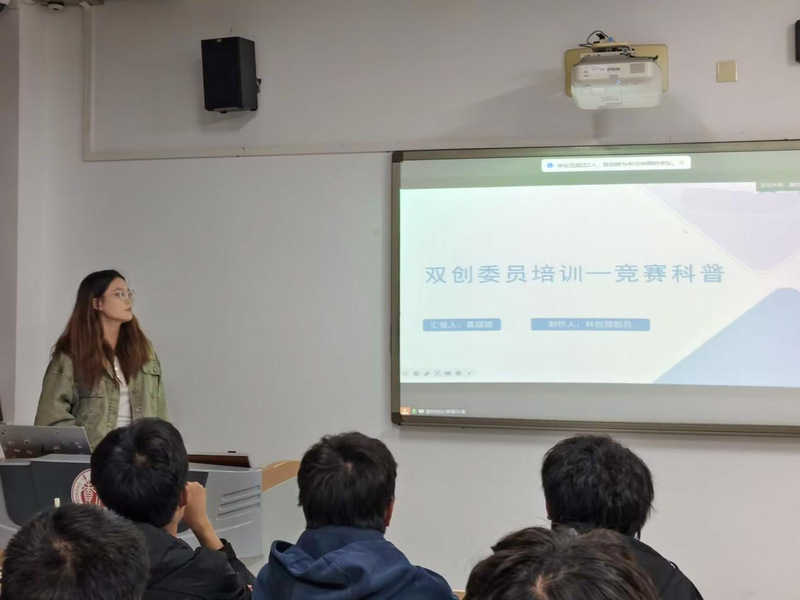 会议上,葛甜甜围绕双创委员岗位职责,明确提出三大核心工作要求:一是做好创新创业政策的宣传解读;二是牵头组织双创活动并做好动员工作;三是及时做好记录工作与信息上报。她强调,双创委员要第一时间将双创群里的竞赛消息转发至班级群,鼓励同学积极参加。随后,她通过PPT演示,详细介绍了多项面向全国大学生的赛事,引导委员们从“不懂如何做”到“主动带头做”,在提升自身组织、策划能力的同时,以点带面激活班级的创新创业活力。