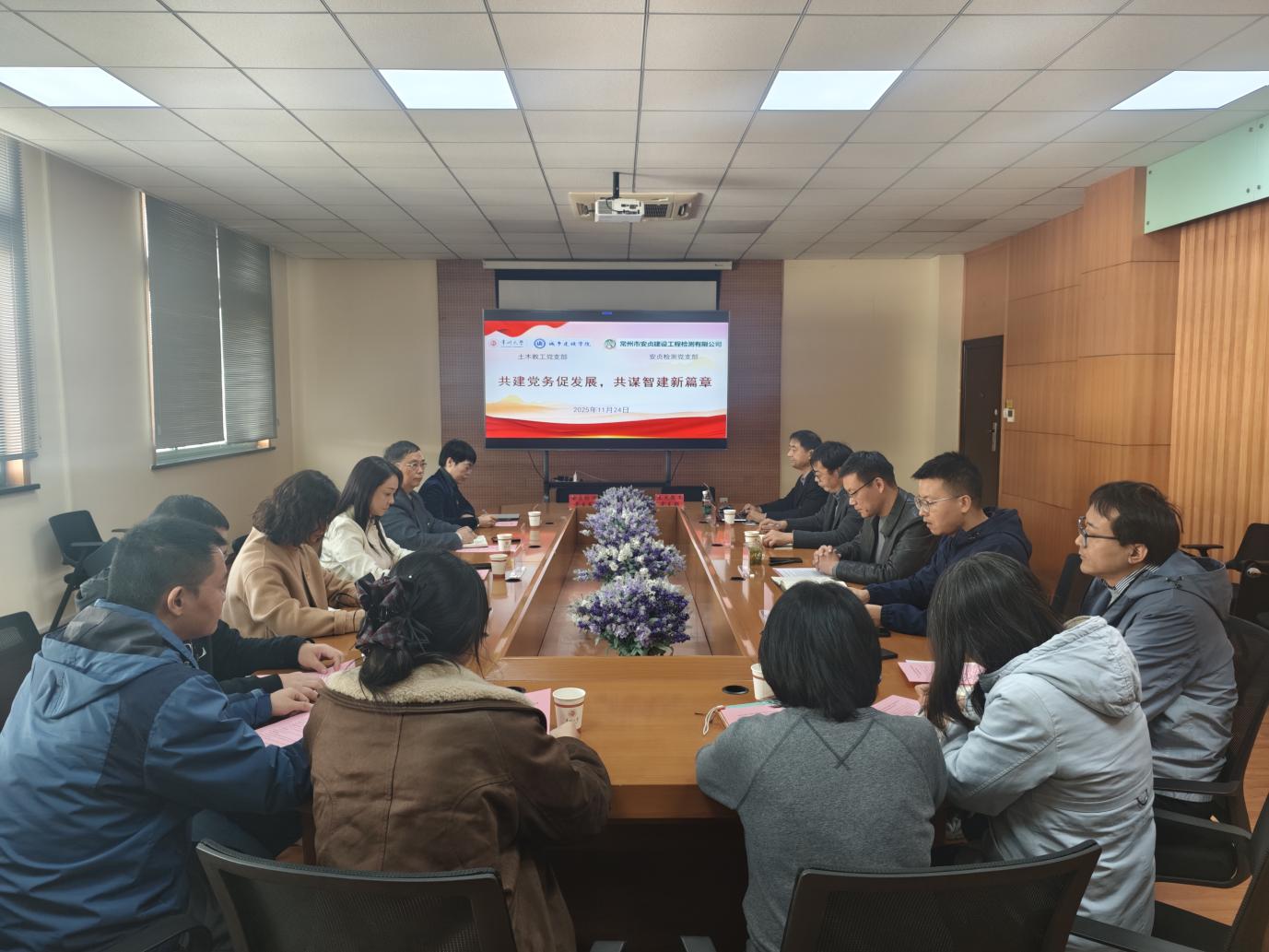 为深入学习贯彻习近平新时代中国特色社会主义思想,提升基层党组织的政治功能和组织力, 2025年11月24日下午,土木教工党支部与常州市安贞建设工程检测有限公司安贞检测党支部在明行楼514联合开展党建共建活动。安贞建设工程检测有限公司党支部书记、董事长、总经理是晓颖,副总经理张晓青等一行十余人,色情卡通