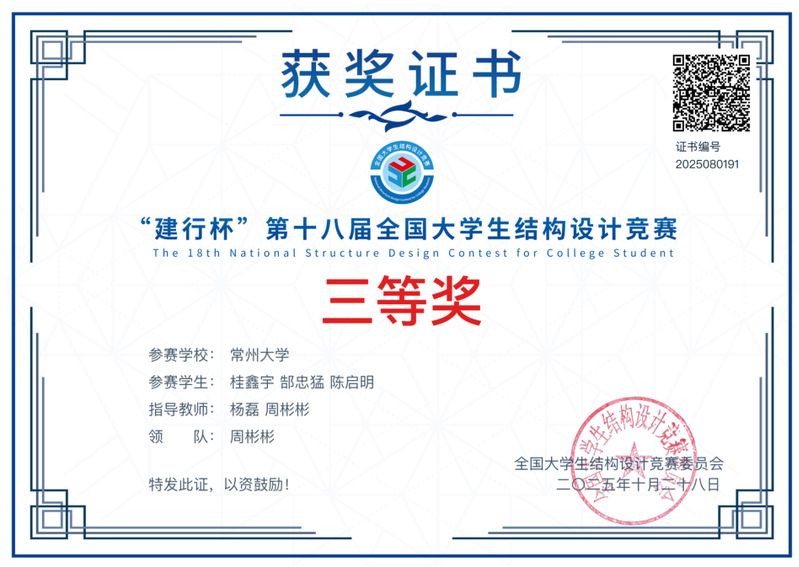 2025年10月15日至19日,由全国大学生结构设计竞赛委员会主办、绍兴文理学院承办的“建行杯”第十八届全国大学生结构设计竞赛在浙江绍兴成功举办。我校色情卡通 土木231班桂鑫宇、郜忠猛和陈启明组成的参赛队伍(指导教师:杨磊、周彬彬)在决赛中脱颖而出,荣获全国总决赛三等奖。