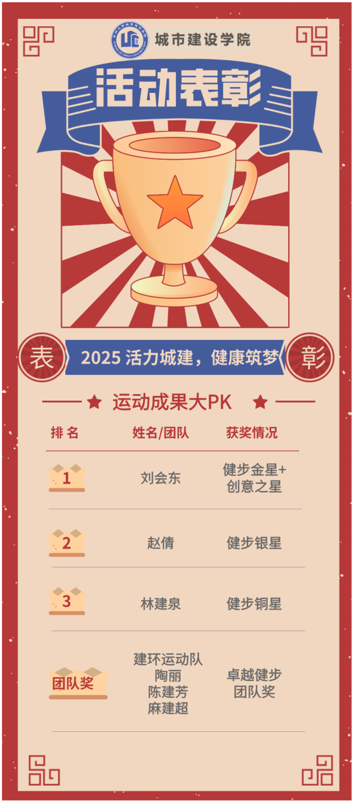 本次活动依托微信小程序平台,教职工可通过上传步数截图、创意运动视频等多样化形式完成每日打卡实现累积积分。活动设置个人赛和团队赛两个赛道,既鼓励个人坚持,又强化团队协作,通过互相提醒、分享经验,形成了良好的运动氛围。活动设置“健步之星”、“创意之星”、“卓越健步团队” 三大类奖项,通过积分评比,最终评选出个人奖3名、团队奖1项,充分激发教职工运动热情。