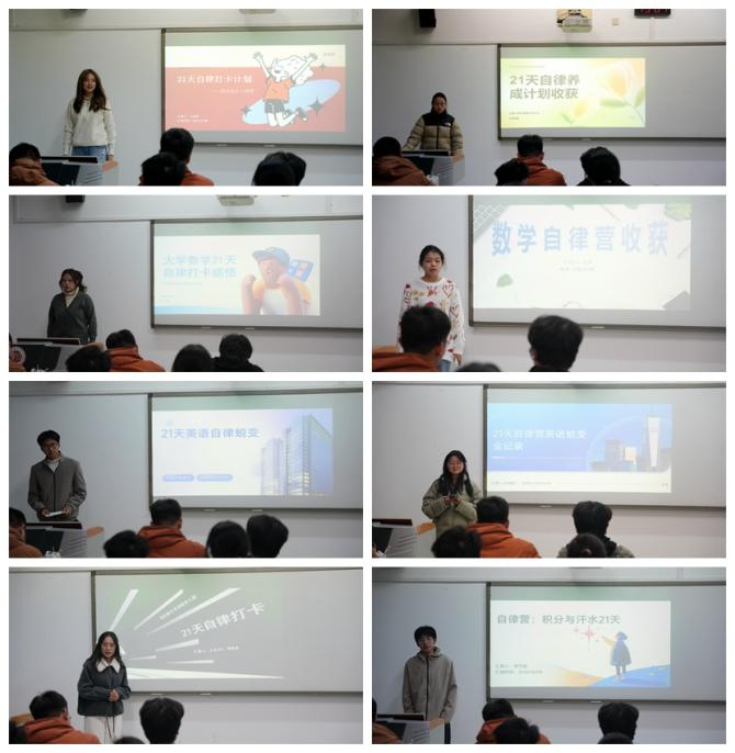 为帮助学生克服缺乏持续学习的动力与外部监督,自律习惯难以养成的困境,学院自律中心通过低门槛、高互动的自律打卡形式搭建学习场景与锻炼任务,社群陪伴强化坚持动力。12月9日晚,“21天自律养成营”分享展示活动在立德楼X111教室顺利举行。自12月10日至12月31日活动期间,共有130名学生报名,76名学生坚持完成21天打卡,最终共有29名选手报名参与分享展示。学院自律中心主席曹睿、学生会主席张鑫到场担任评委。